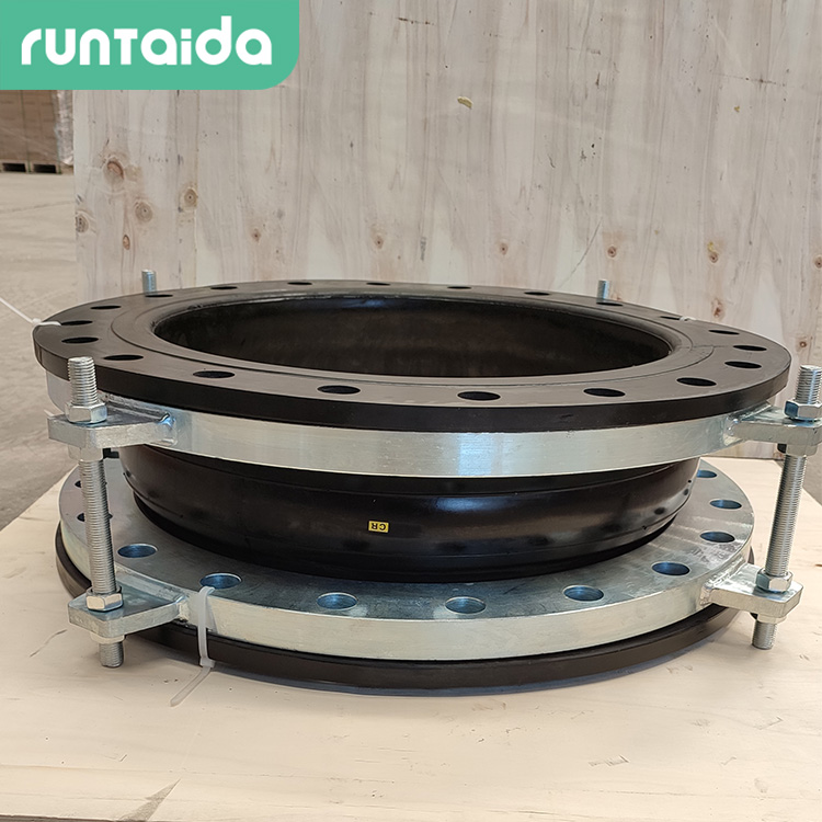 大翻邊橡膠軟連接安裝時應先將對應法蘭與兩端管道垂直焊接,注意法蘭水線面朝外,兩端法蘭間預留長度為可曲撓橡膠接頭的安裝長度。用連接螺 栓將球體法蘭與對應法蘭連接,用對角法順次平行壓緊螺母,切勿壓偏,通水試壓承重后按此方法重復將連 接螺栓依次緊固。 用控制拉桿上的限位螺母將橡膠伸縮節調至安裝長度,通水試壓后打開控制拉桿上內側的限位螺母預留伸縮量,